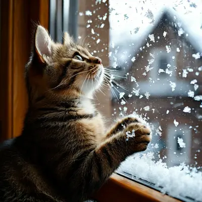 разнят котика снежинки, пролетая за окном. Смотрит Васька и игриво машет сереньким хвостом. Белый снег весь двор окутал, и деревья, и дома. А по краю крыш свисает ледяная бахрома.